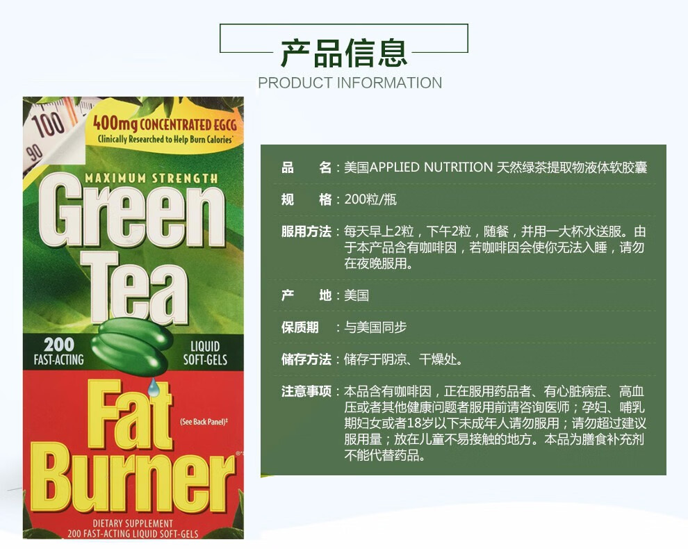 Green Tea Fat Burner 绿茶燃脂软胶囊能够加速新陈代谢,将食物转化成能力,增加脂肪的燃烧,在减轻体重的同时保证充沛的精力。Green Tea Fat Burner 采用的是液体软胶囊,能够保证营养成分的完全吸收,其吸收效果是片剂的200%。Green Tea Fat Burner绿茶燃脂软胶囊含有多种有效的草本精华,既能提供人体需要的营养成分,又能控制体重,配以健康的节食计划,能够达到事半功倍的瘦身效果。独特的绿茶精华配方研究证明EGCG (绿茶多酚)以及绿茶中的其它有效成分能够帮助控制体重。