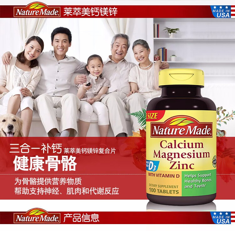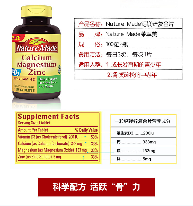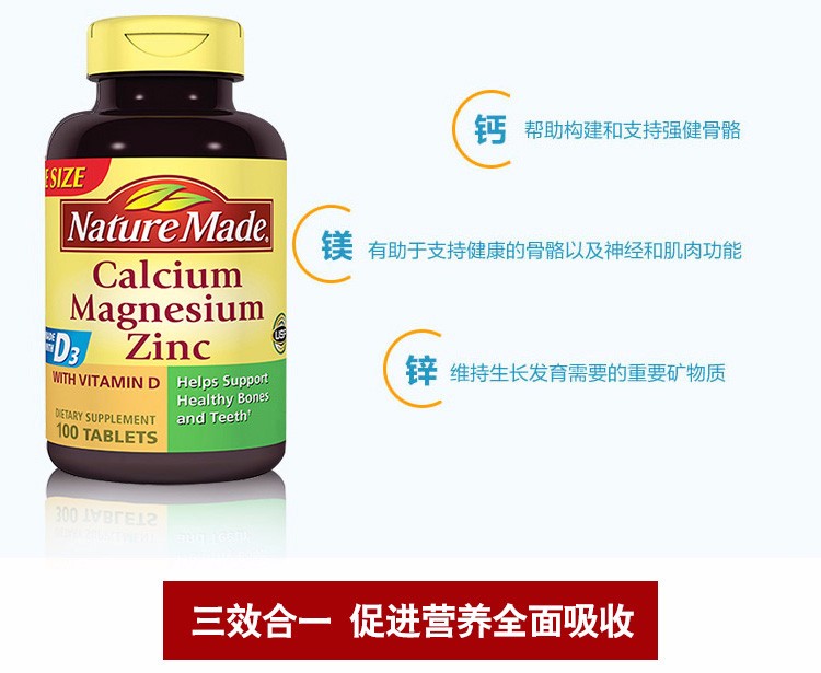 【产品名称】Nature Made钙镁锌片+维生素D3 100粒