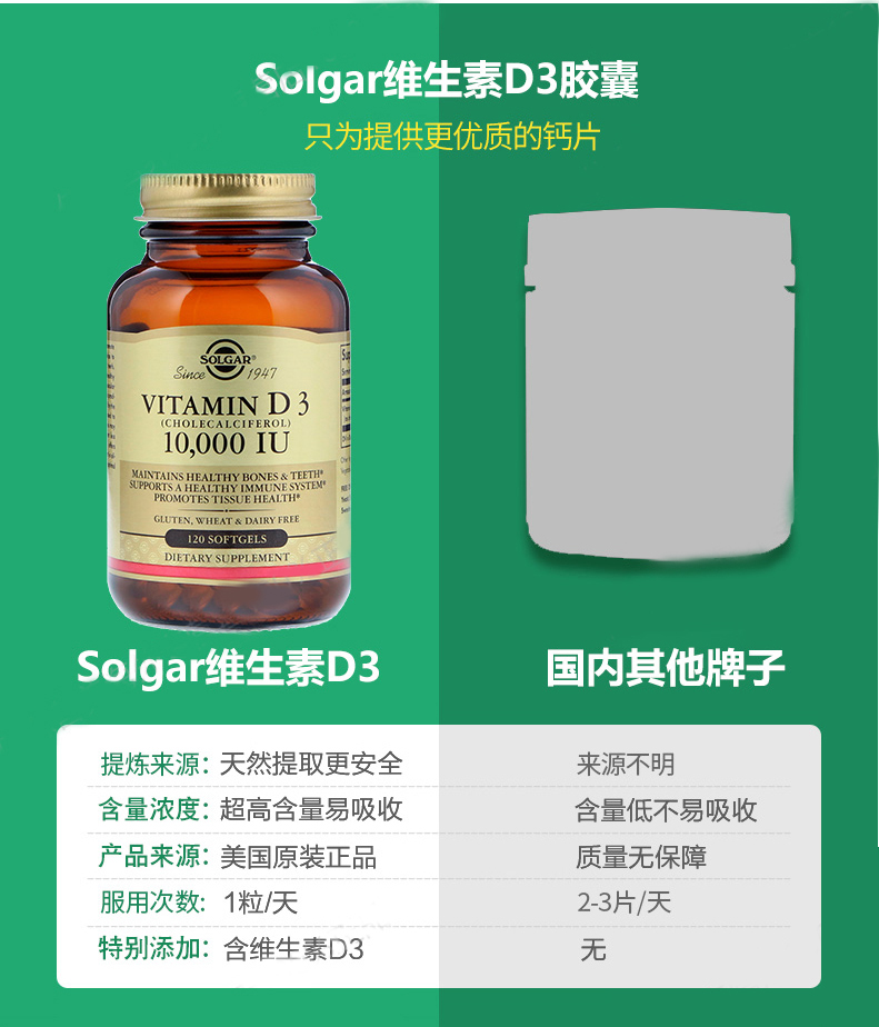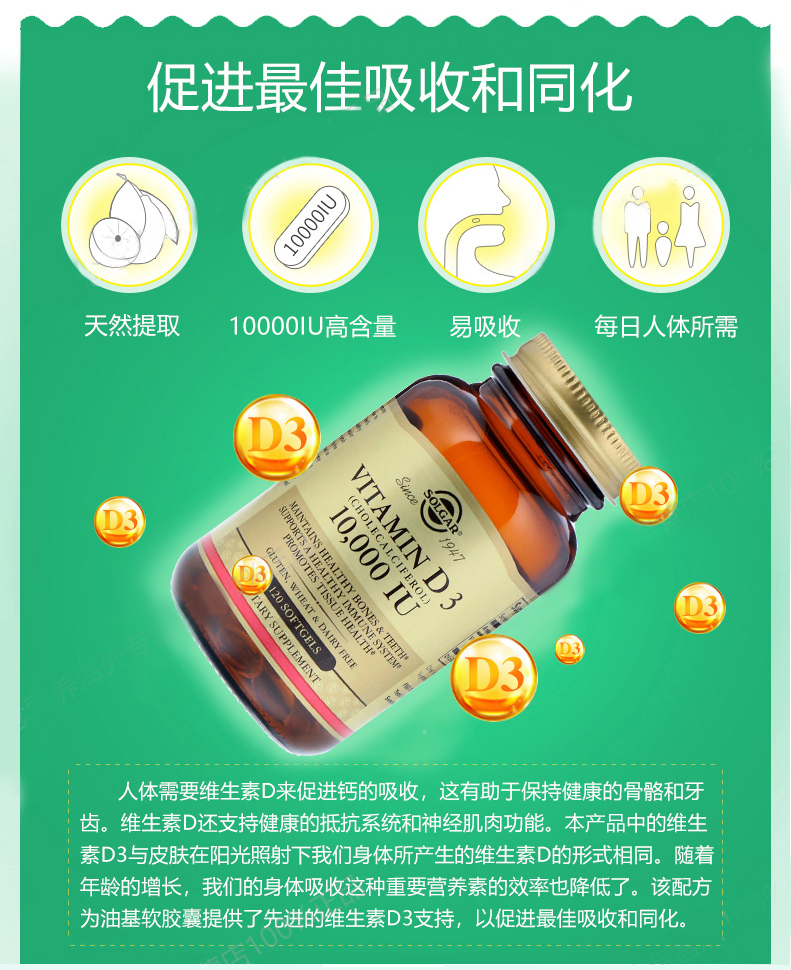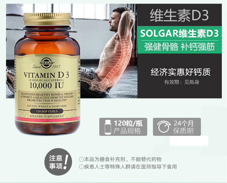 产品名称:美国Solgar维生素D3胶囊10000IU120粒VD促进钙质吸收强壮骨骼